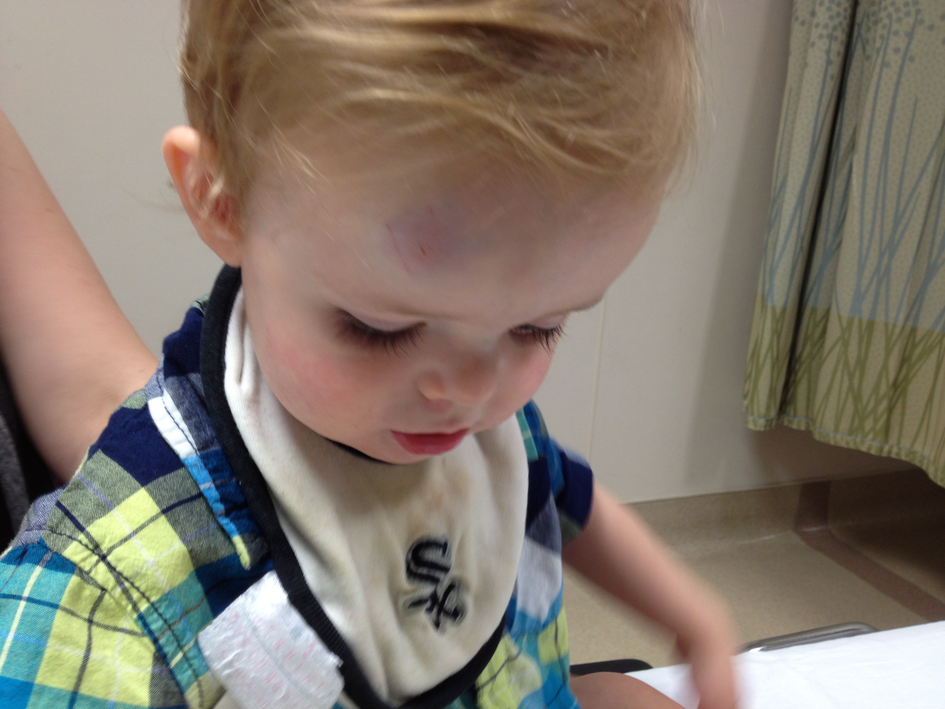 Today you had your worst tumble ever. While mommy was reading to you on the couch, you stood up and pitched forward landing on the hardwood floor. When daddy got home you had a massive “goose egg” on your forehead, so we took you to the emergency room.
