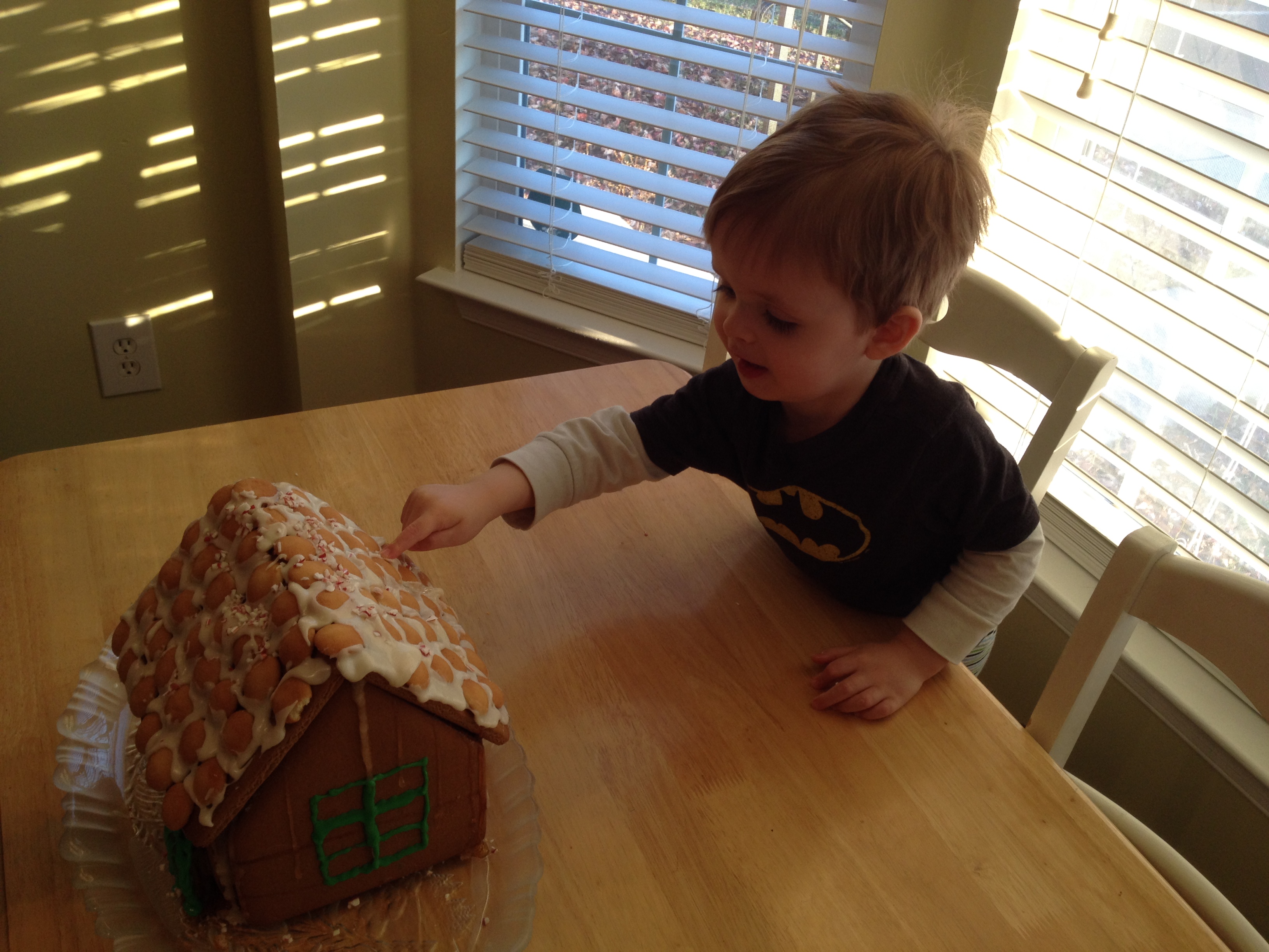 Then it was all sticky goodness as Mommy made some icing and we decorated a gingerbread house Mommy assembled while you were sleeping! You seemed to be far more interested in tasting our materials than decorating with them. But it came out just fine.