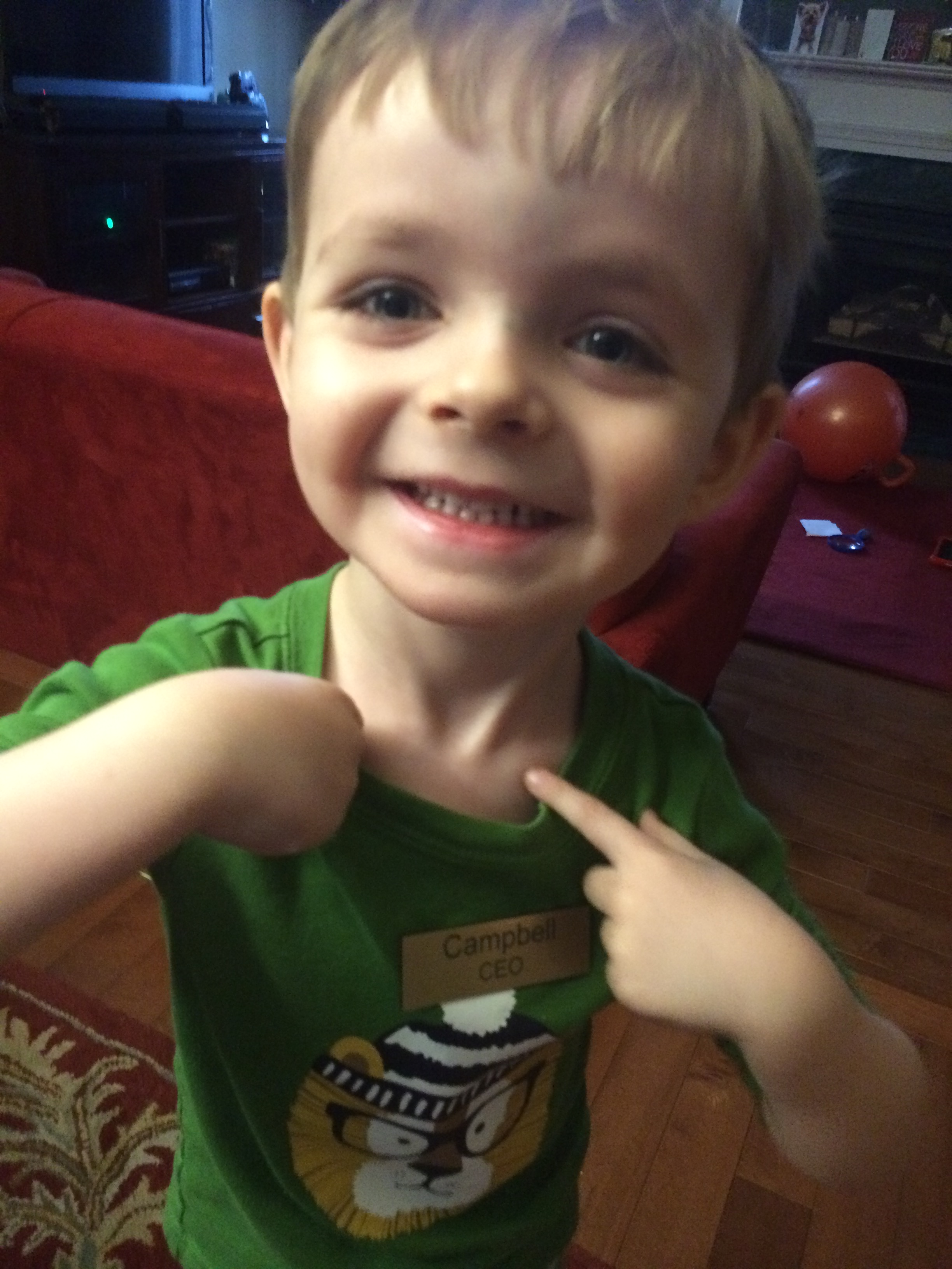 Daddy went on a business trip later that month and returned with your very own CEO NAMETAG! You’d asked for it many times and now you were officially the CEO of “Campbell’s Pizza.” You originally shared some troubling ingredients with us, but you’ve settled now on serving pizzas with “goat cheese and double cheese”.