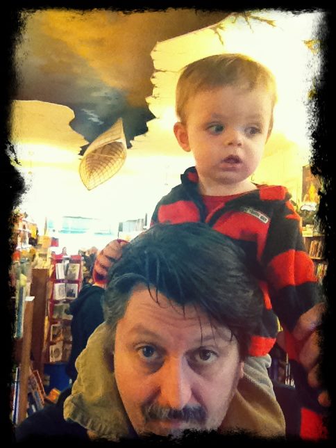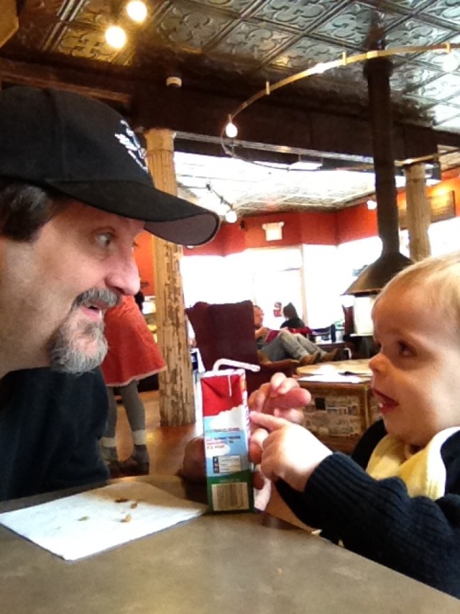 That Sunday we took the South Shore Line to see your Grandma & Grandpa Yeoman. They drove us to a restaurant in Valparaiso, IN called the Industrial Revolution where we celebrated your GREAT grandmother’s 93rd birthday. You had a pretty good time, because the restaurant had a train that circled above us. Before we left you saw Grandma’s Christmas lights in her yard. Later that night, we returned to Chicago and you were fascinated by the frost your breath made on the train window.