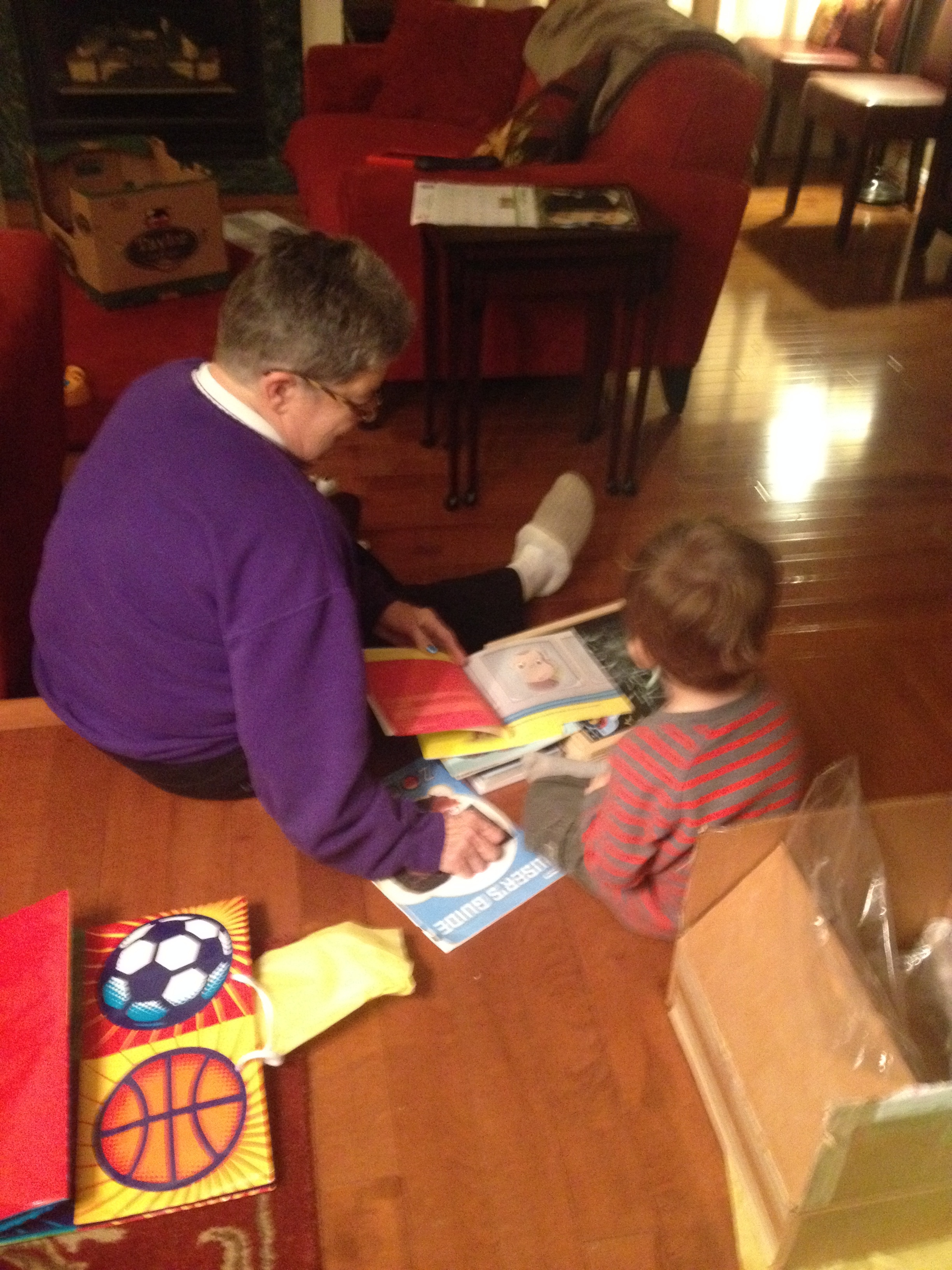 After the Chicago trip, Christmas week came! And oh what a Christmas it was! Your favorite friends of Daddy and Mommy (Colin and Beth) came over to visit. They even brought you two very cool toys that you enjoy and we spent the evening decorating cookies with them. Grandma and Grandpa sent you butterflies that you can assemble into a big mass. Mommy and Daddy got you art supplies and some small things from the Disney Store. But the next morning, you got the Santa loot! He remembered your request for the game “Who Shook Hook?” and brought you some City Legos too. But that hardly topped all the Legos Uncle Todd sent you! (Mimi and Doc sent you a check too so you can buy even MORE Legos if you want).