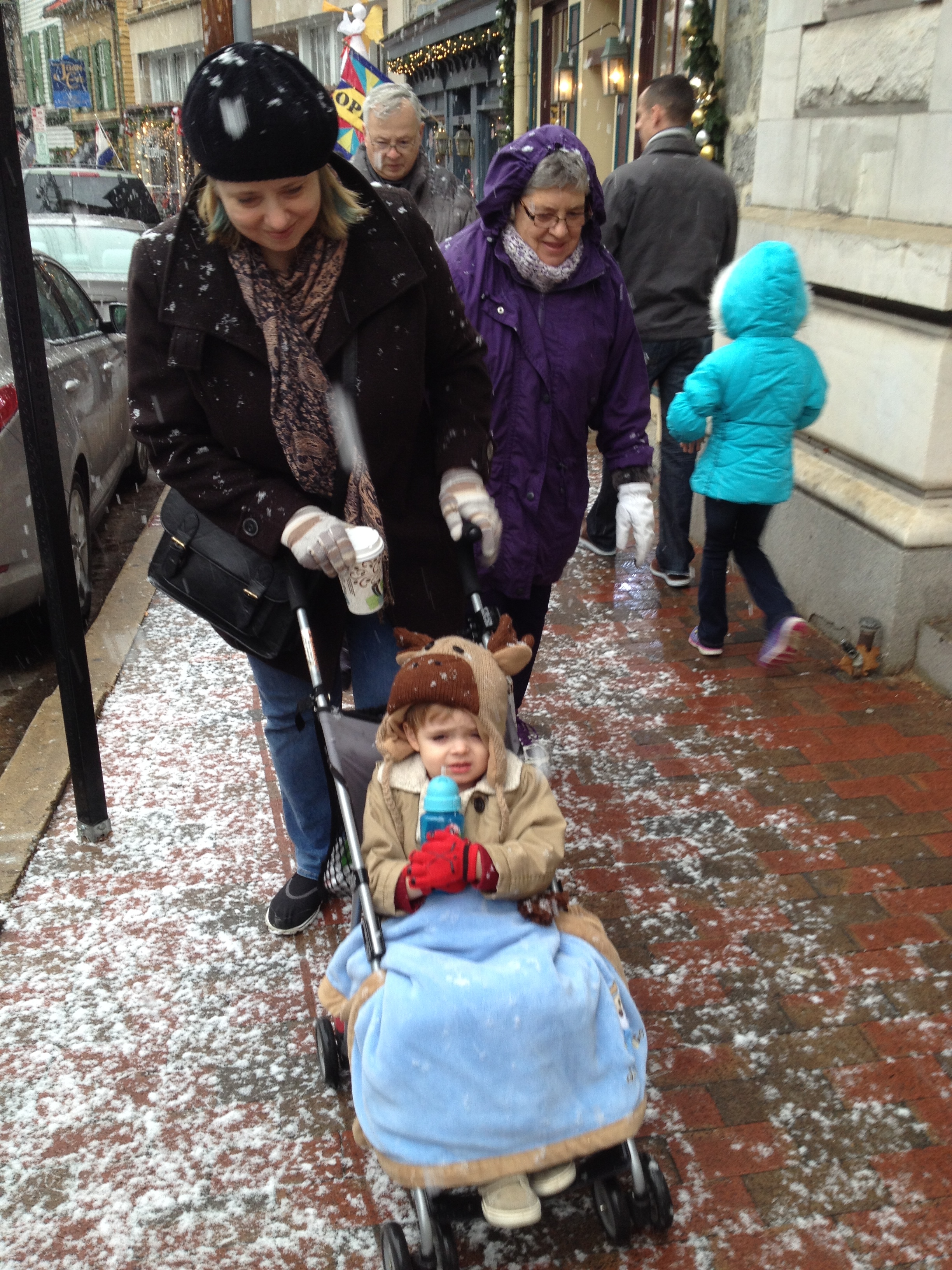 On the next day we took a very short trip to Ellicot City and had lunch at one of our new favorite places, Bean Hollow. We walked around a little more, did a little window shopping, and like magic, it began to snow in big fluffy flakes. That night, you opened a LOT of Christmas presents with Grandma.
