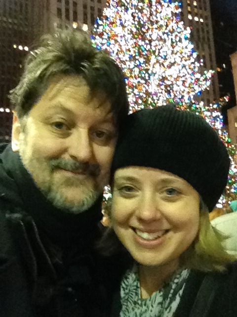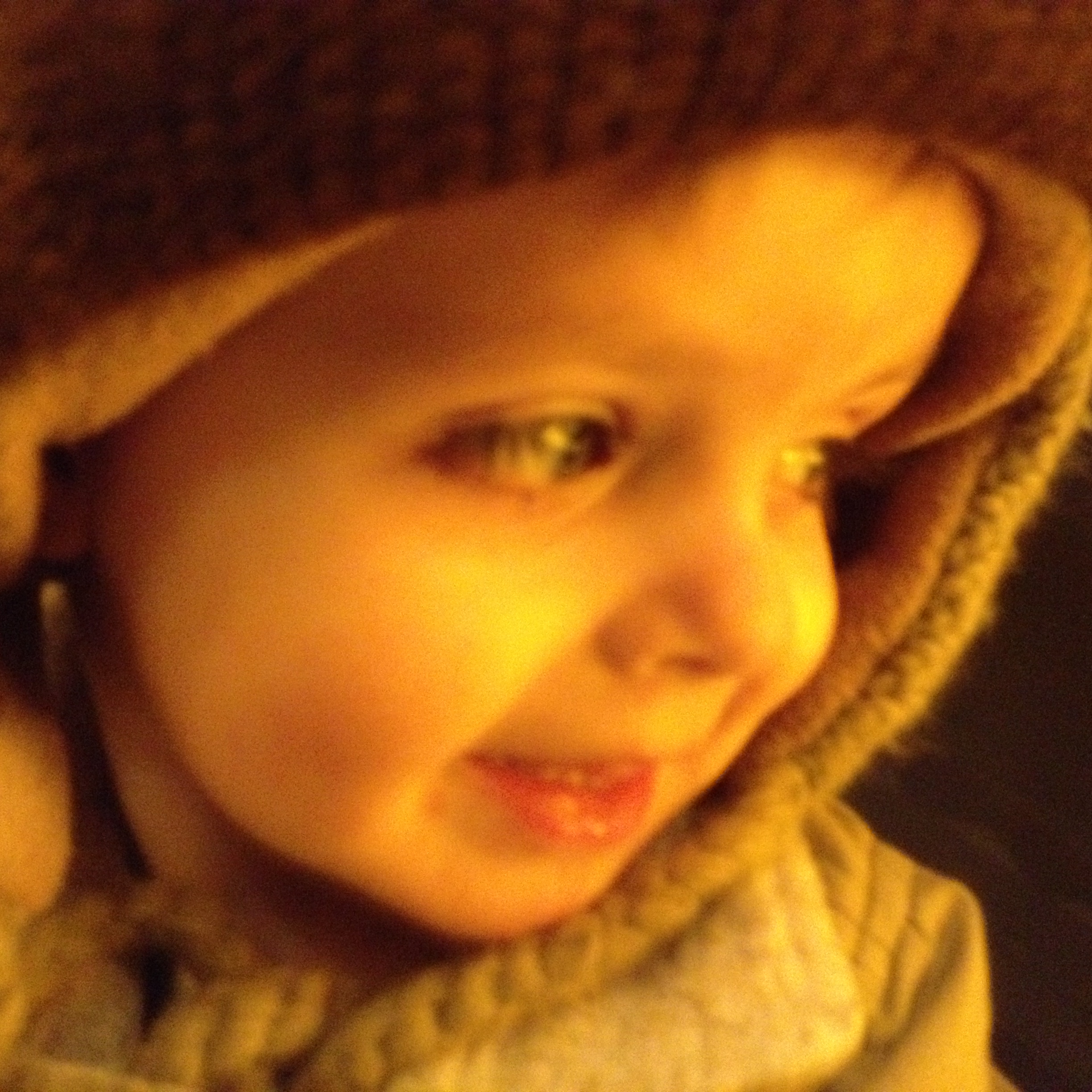 Once we settled down in our hotel, The Ameritania, we decided to take a walk to see the Christmas tree at Rockefeller Plaza. Getting there wasn’t so bad, but once we arrived it was packed tight with lots of folks who had the same idea. You fell asleep when we got there so you missed a lot of the hub-bub. We also got to see a great light show on the side of Sax Fifth Avenue, but we were worried for your comfort because it was quite cold. So we made our way back to the hotel and met up with Uncle Chad and Aunt Amanita for dinner. It was hard to find a restaurant that wasn’t a chain (we were in Times Square), but we walked around until we finally found a little Mexican place that we all enjoyed. Daddy took you to the toilet there where you insisted had a kitty on the wall, though Daddy never saw it.