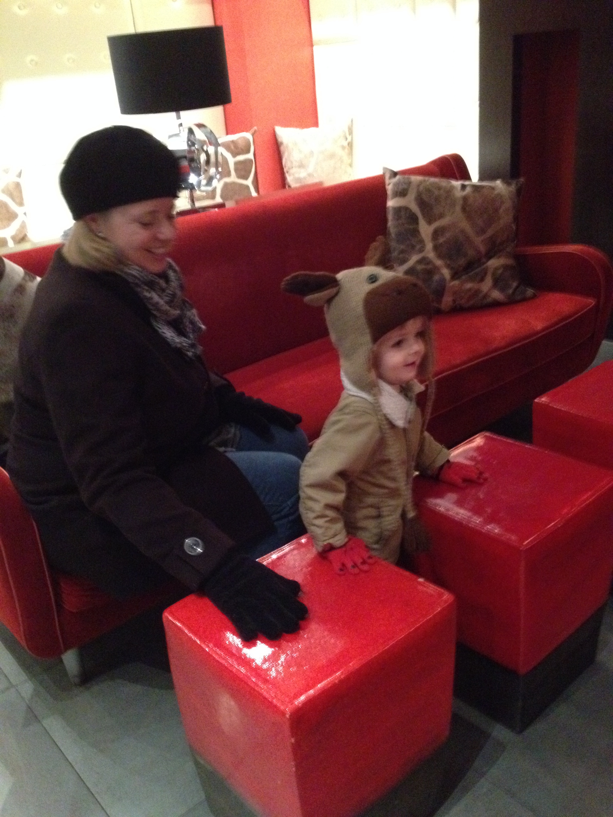 The next day we went to Central Park where we bought hats, treated you to your first bagel (and you loved it) and decided to walk around a bit, even though it had gotten colder than before. You had a bit of a melt down because you weren’t allowed to use the swings; not our fault because the playground section of the park was actually closed for the holiday. Aunt Am had suggested we see the carousel, but that proved to be an even bigger disappointment for you, since it too was closed for the season (Aunt Am didn’t know). After a good cry and some snacks, you pulled it together and we warmed up in a visitor’s center, then headed to FAO Schwarz.