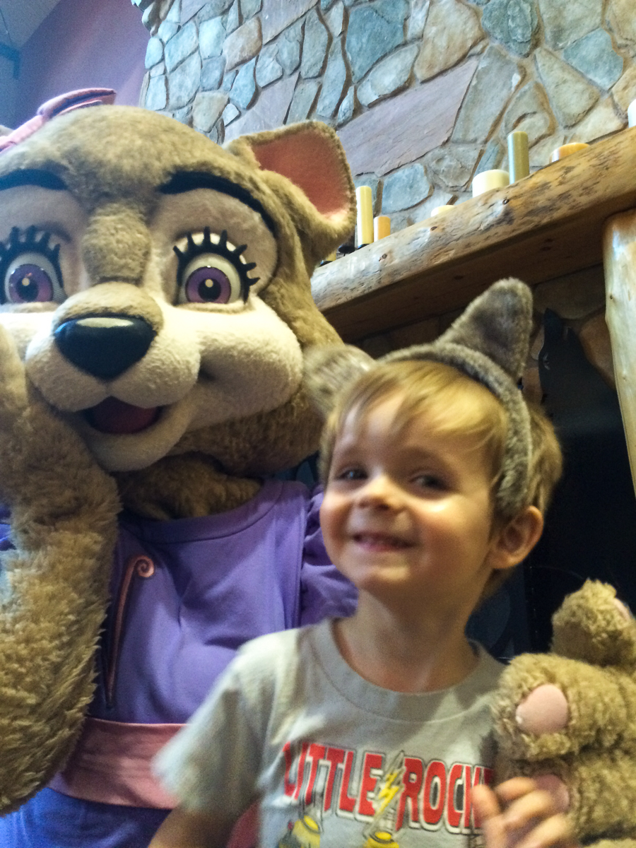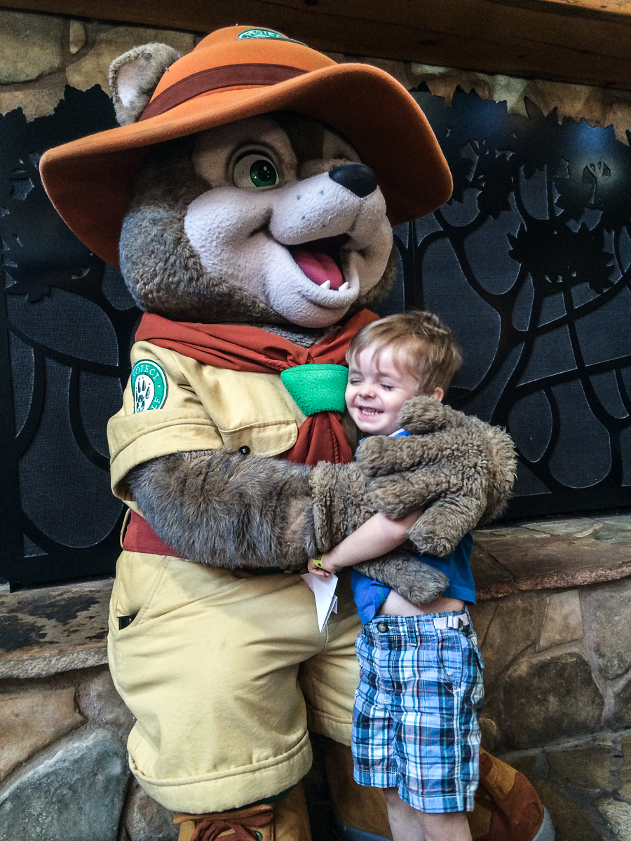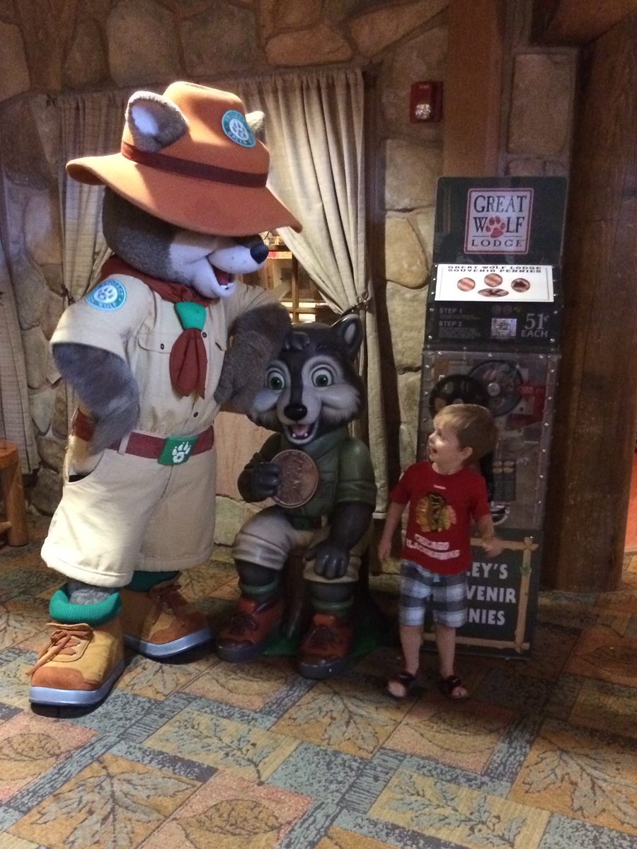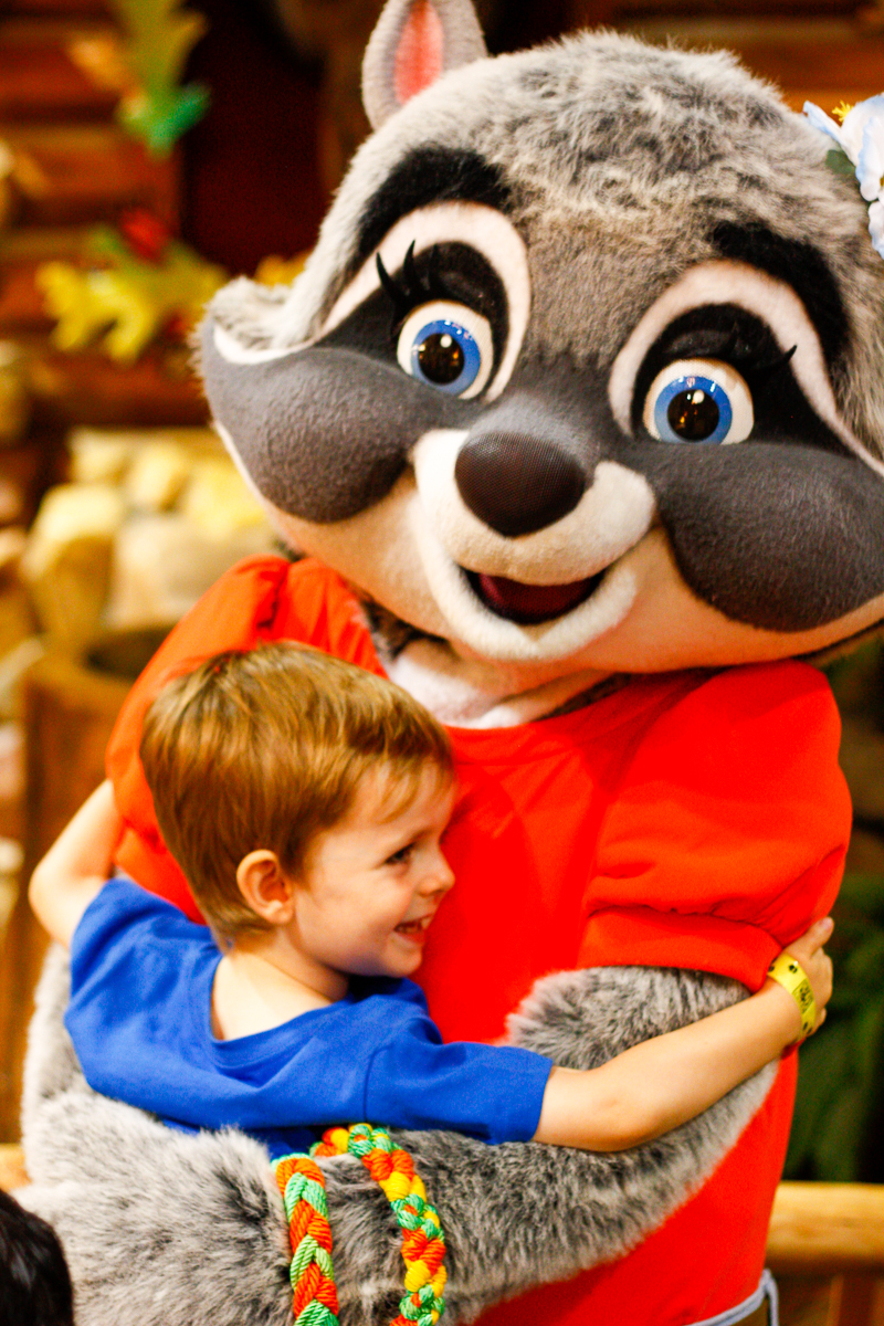 We left Maryland that next Monday and set up “camp” at Great Wolf in Williamsburg, VA. You got a picture with Violet your first night and then, at breakfast the next day (in the Loose Moose), you got to see Oliver the Raccoon. The huge water park, story time, Shadowquest, characters… you were quite occupied.