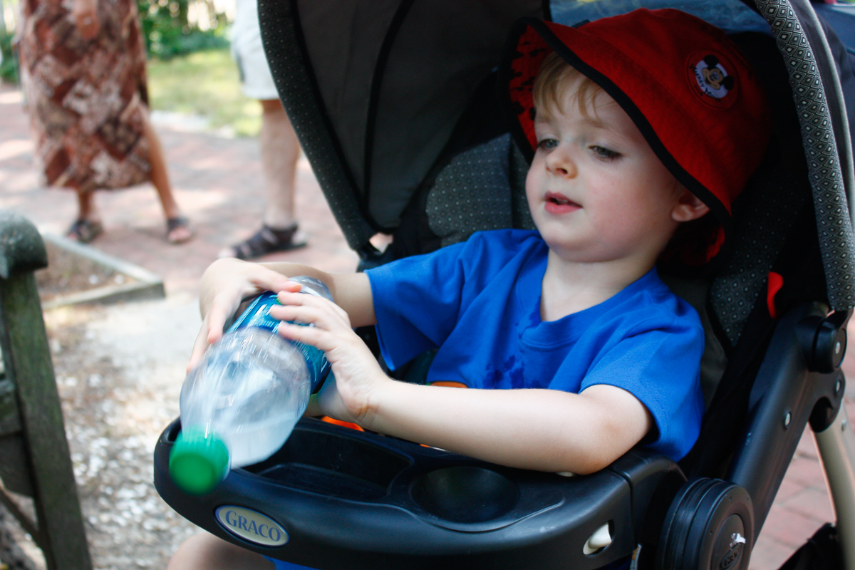 Later that week we went to Colonial Williamsburg. It was hot and we didn’t spend the money to go inside the houses, but we DID walk all around the colony. We saw the Governor’s Mansion, several stores with authentic craftsmen and a fife and drum brigade that marched down the street.We also went into a cool Scottish shop, cheese shop and candy store. It was terribly hot but you seemed the least affected by it. Perhaps it was your cold water and floppy hat that Daddy should have adopted.