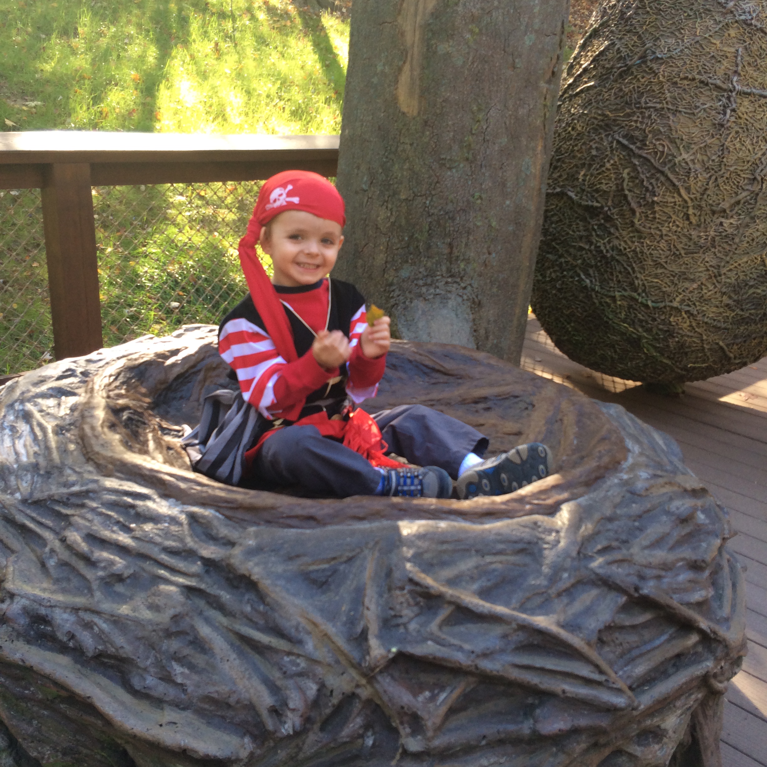 Before you know it, it was time for the Halloween season. We started it by decorating the house with some spooky stuff, which you REALLY really enjoyed. You painted pumpkins, which went on the mantle and you made a very nice Frankenstein’s Monster head in school. Using our new found pirate powers (from your costume), mom and dad joined in and we descended on the Maryland Zoo during the Boo Zoo weekend. After you plundered the candy and survived a hay maze, you gave one of the nice girls there a doubloon and for your generousity she gave YOU a stuffed raven! (We won’t tell her it was a plastic doubloon… yarrrrr).