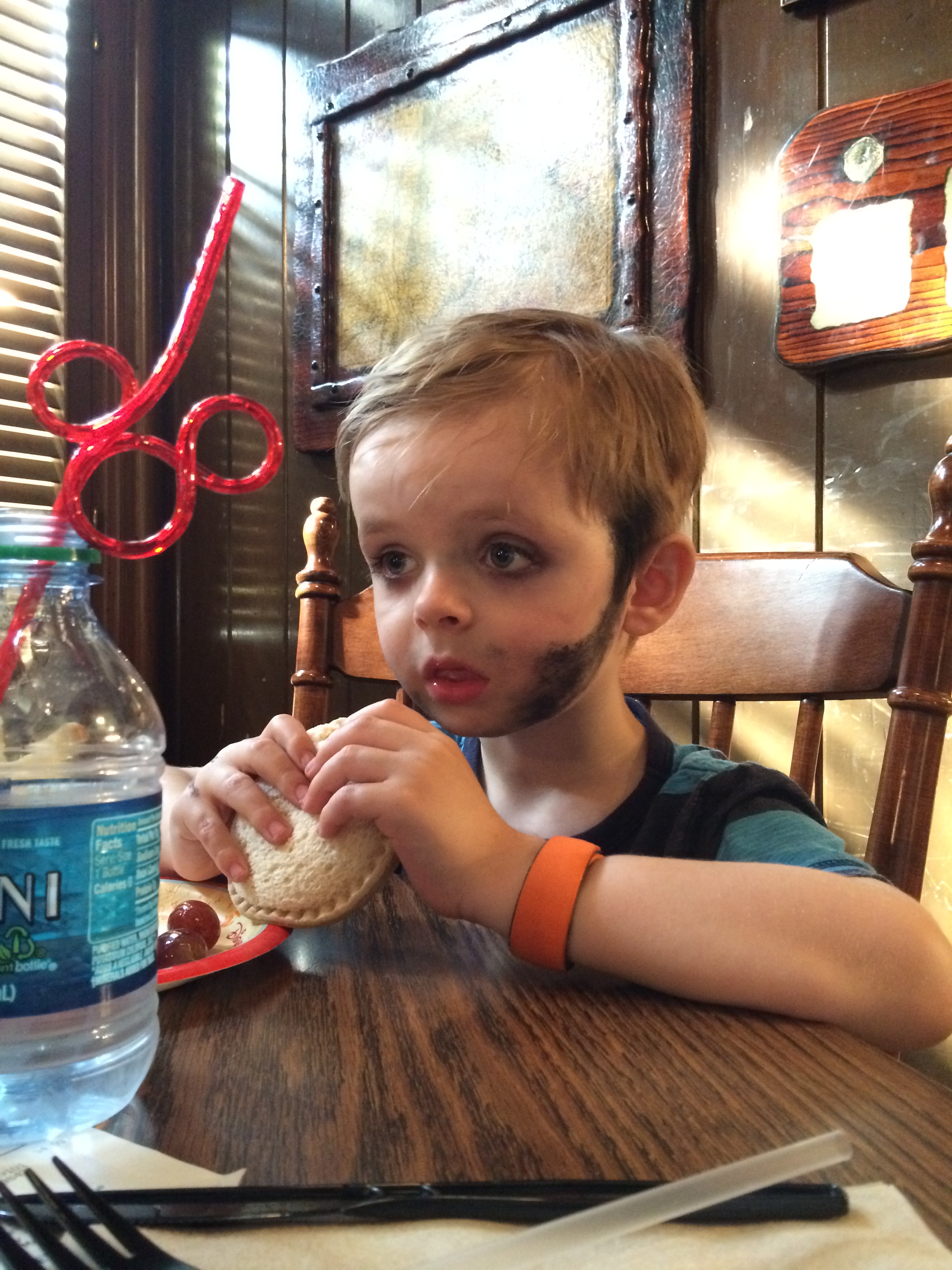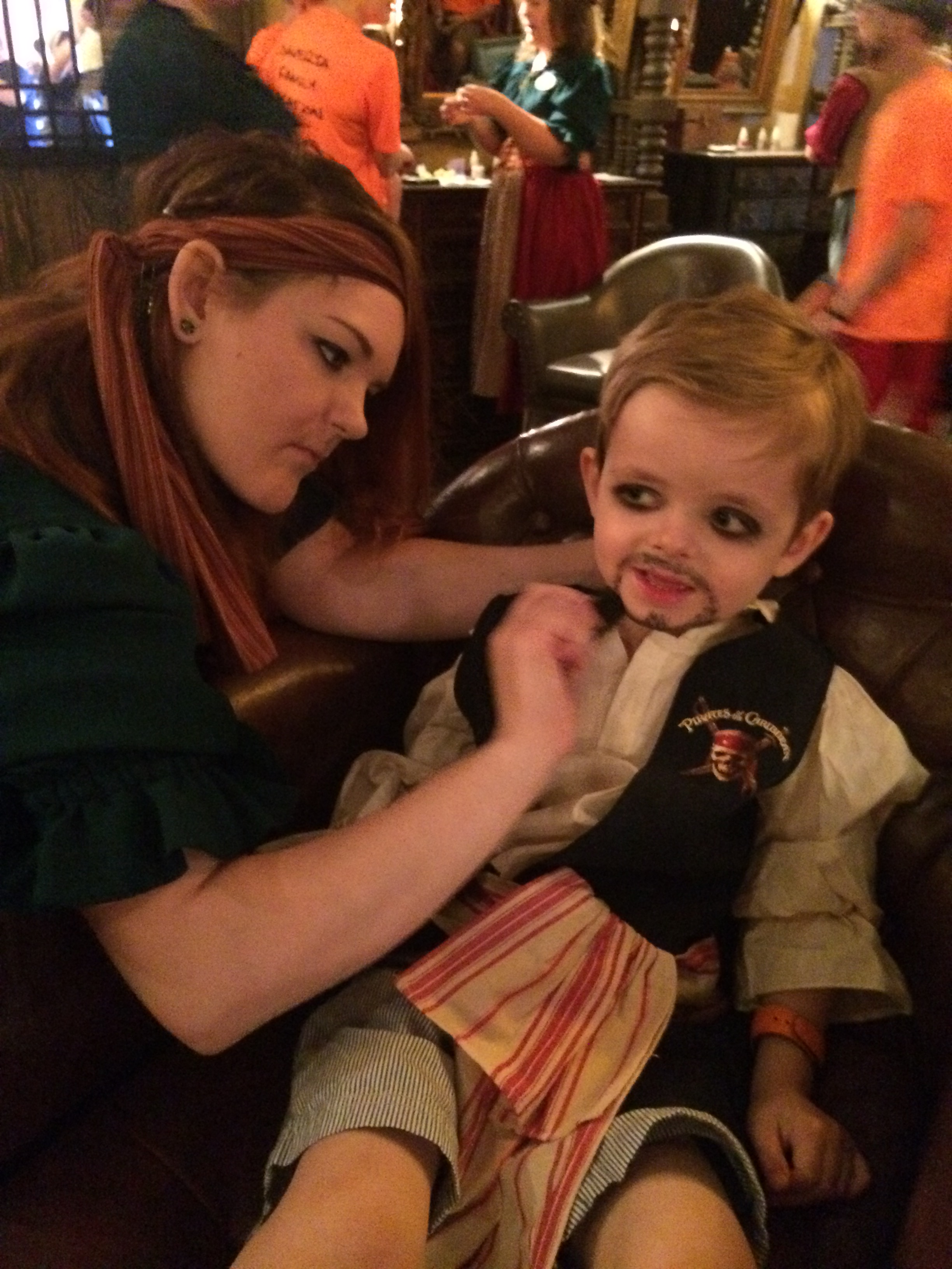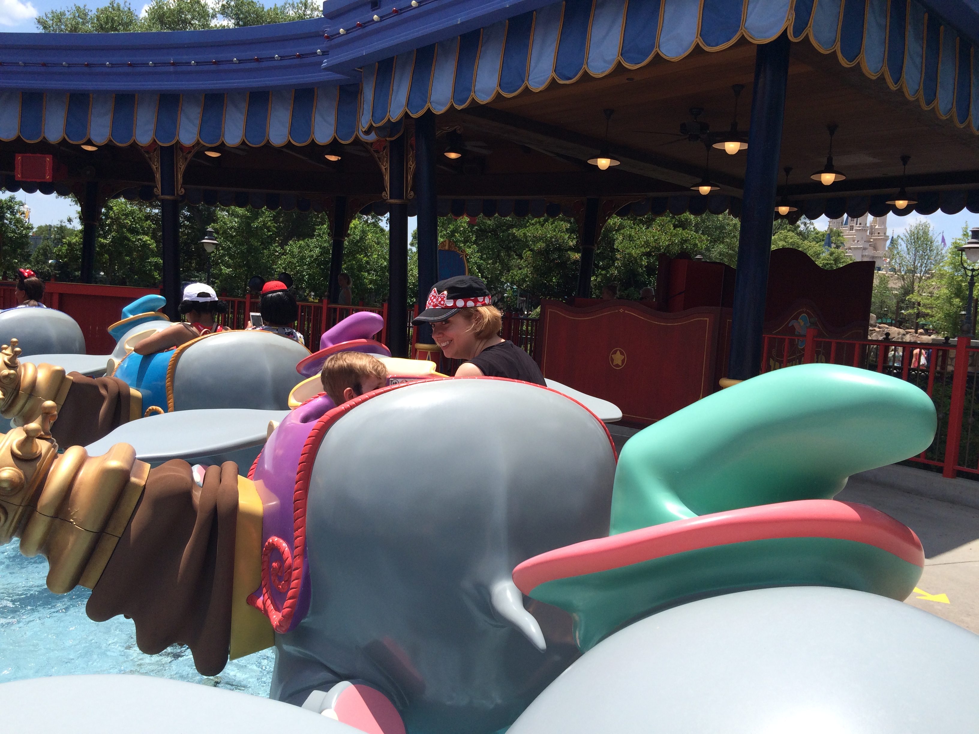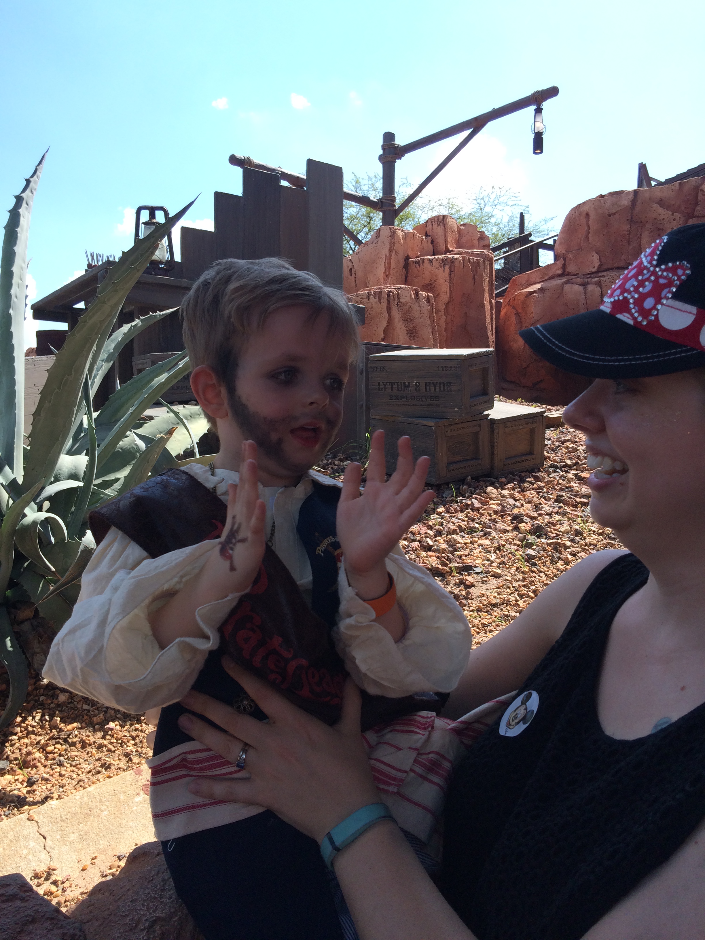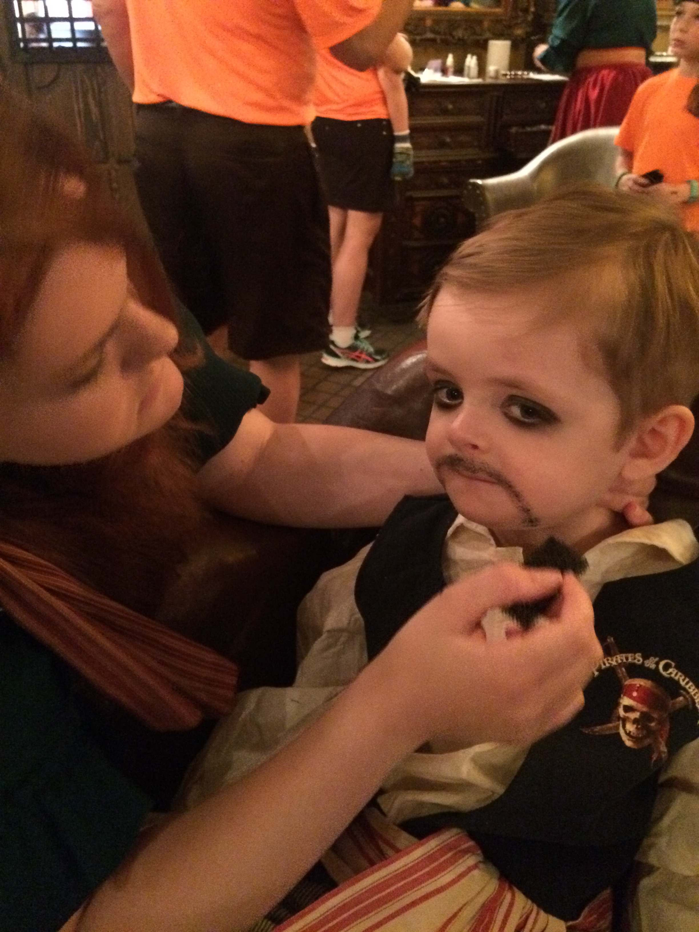As the day wore on, your pirate “beard” ended up smeared across your cheeks, eyebrows and even your forehead. But nothing would stop us! Goofy’s Barnstormer, Thunder Mountain Railroad and the new Seven Dwarves Mine Train were all available to ride since you were 40 inches tall! You seemed hesitant at each rollercoaster, mildly terrified while on them, but thrilled at the end of each one, describing the excitement you felt at each ride. And we also got to do some standards too, like Haunted Mansion, Dumbo and It’s A Small World.