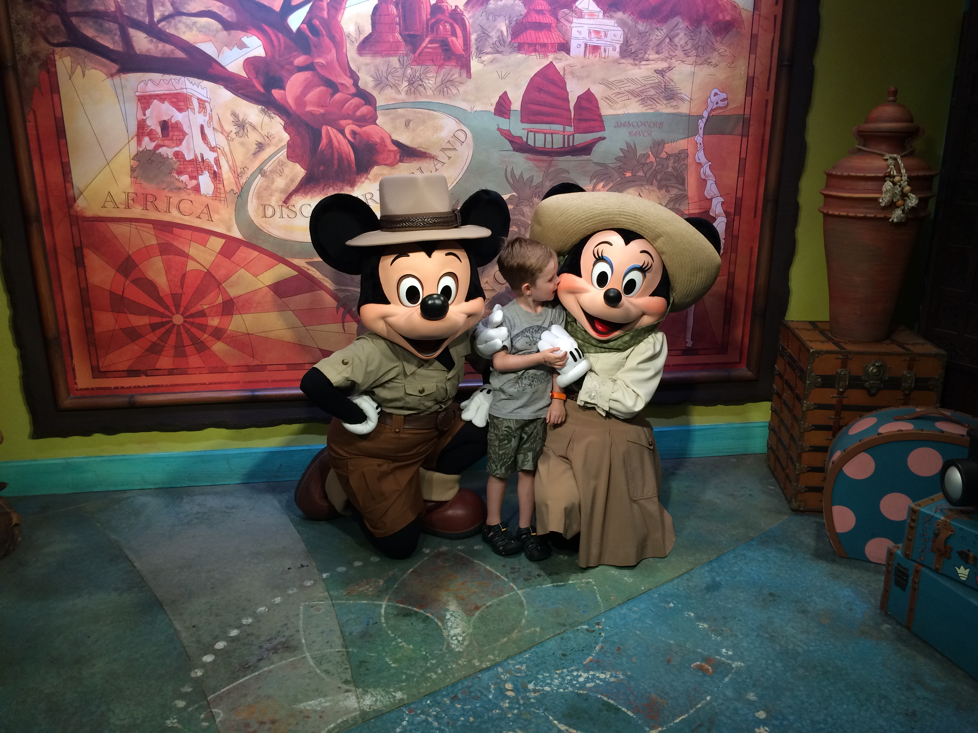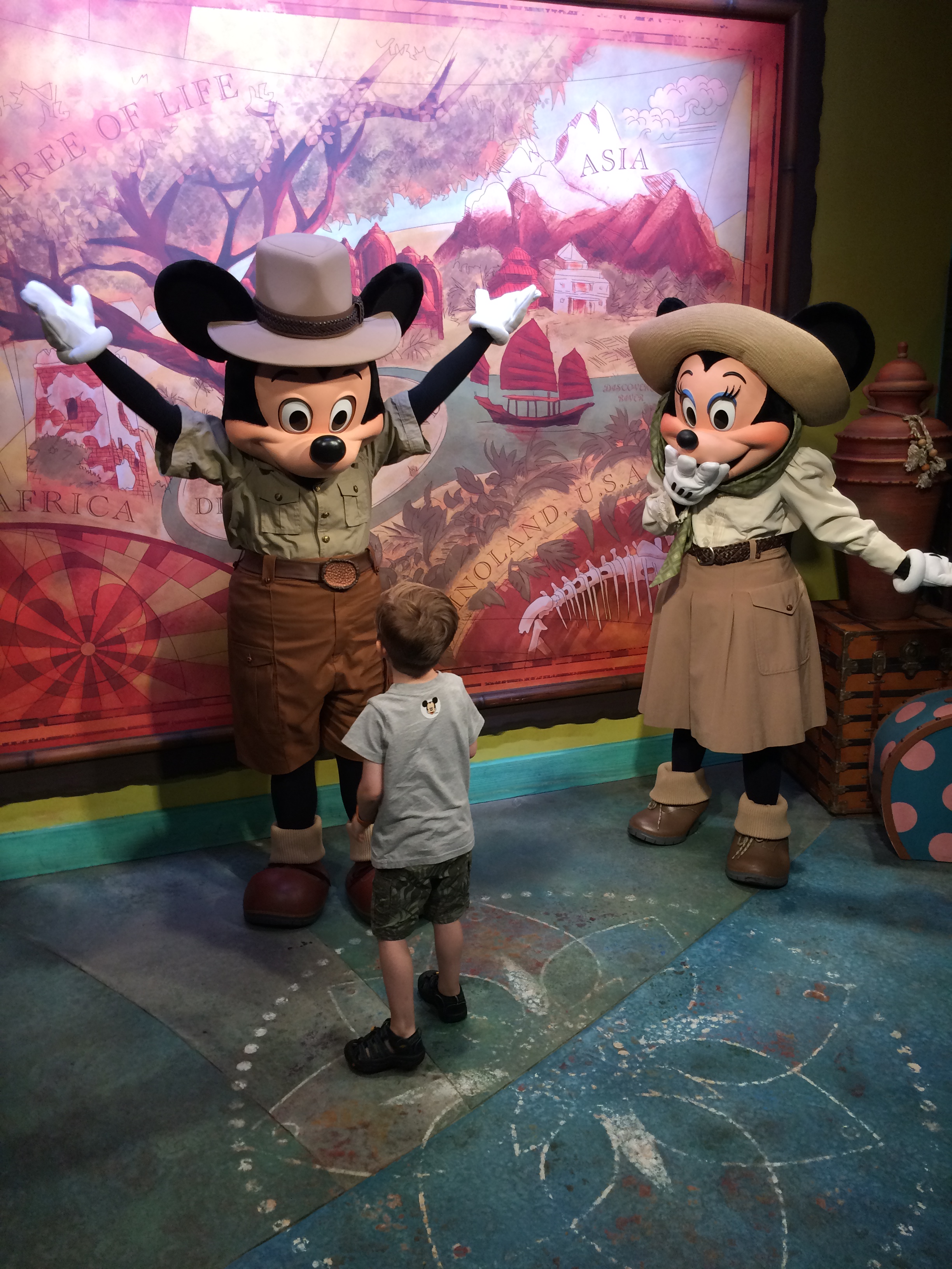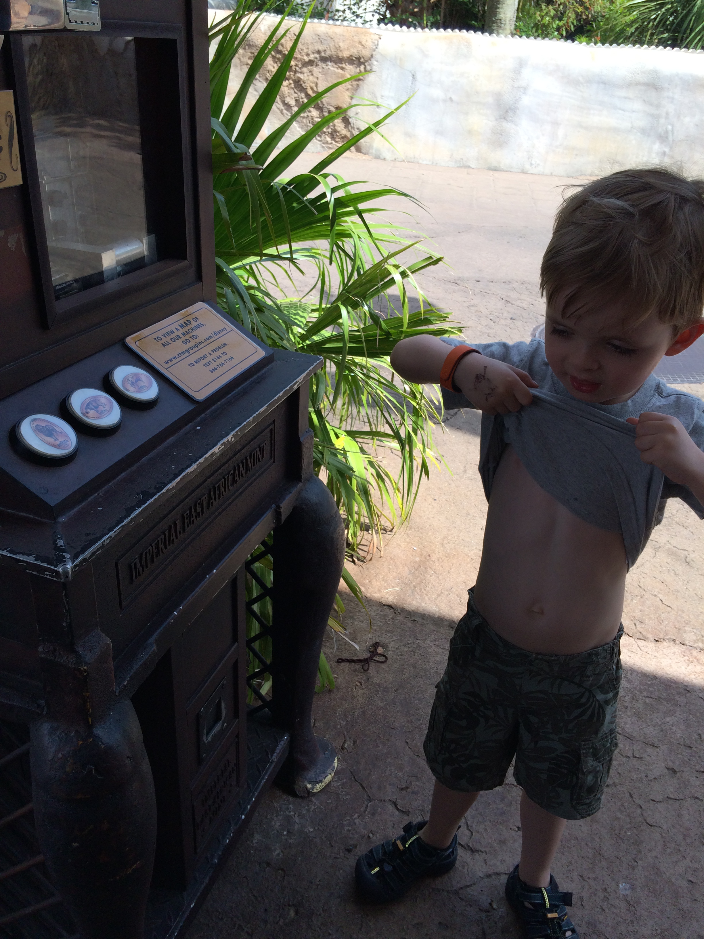 And this was Animal Kingdom Day. When we got there, because you couldn’t scan your magicband multiple times you had a bit of a fit. It was hard to get your attention until we went to Kilimanjaro. You weren’t allowed to ride the Expedition Everest, but the yeti images and colorful flags seemed to distract you well enough. And we finally got you interested in the Wilderness Explorer badges that were all over the park.