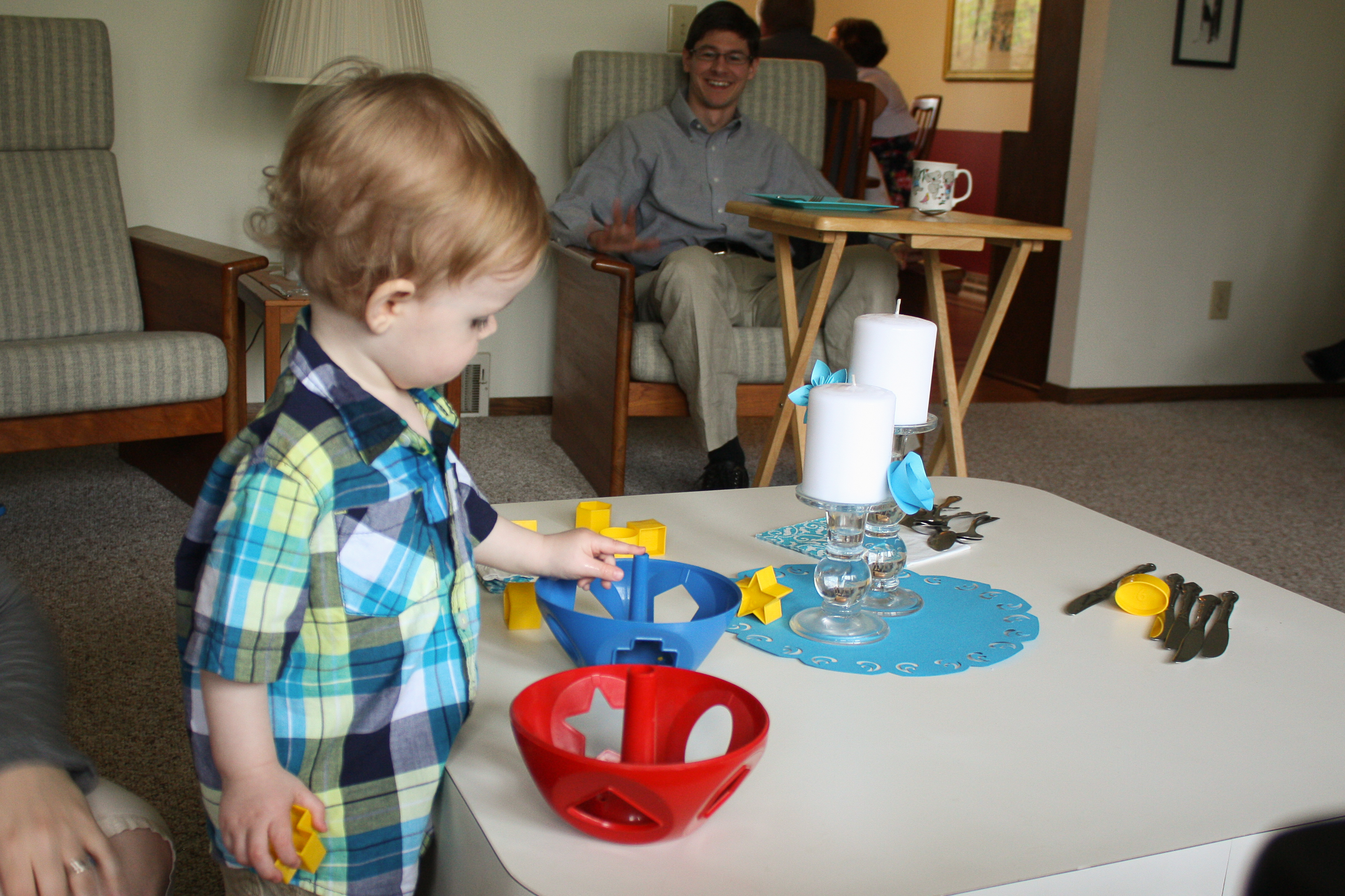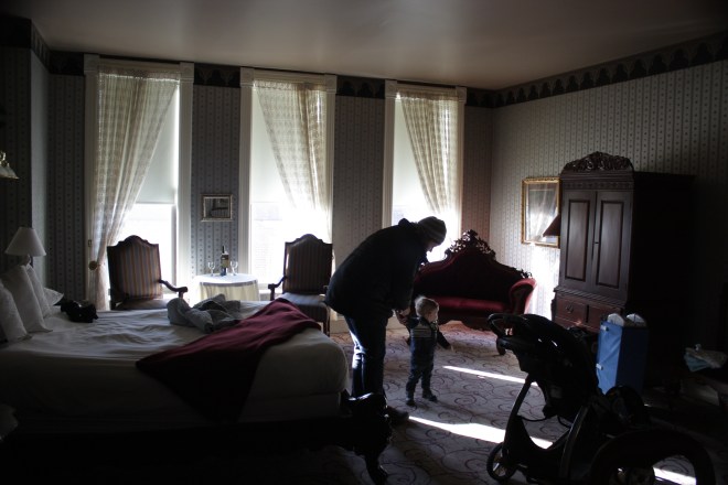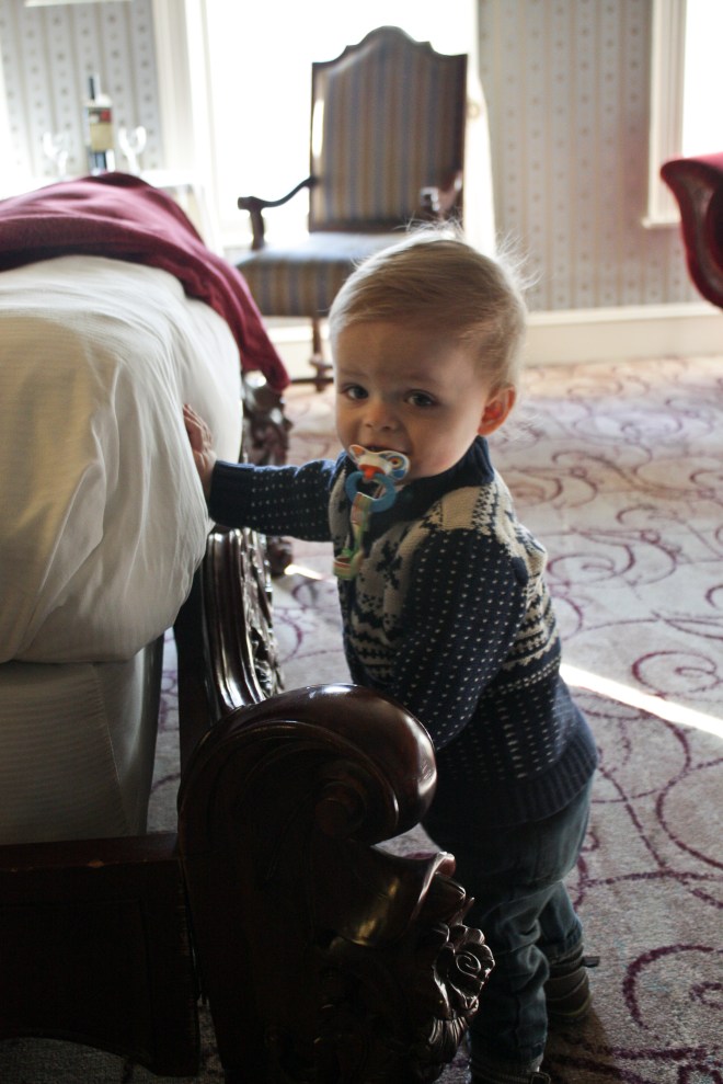 The first night we were there we went to story time and you only lasted as long as the clock show (an animated adventure with a talking owl, squirrel, beaver, turtle, little native girl and a settler boy from Joliet). You got so squirmy we decided to just finish stories in the room, but you weren’t too thrilled about sleeping in a borrowed, uncomfortable crib in a strange place.