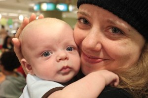 Your mom and I went to a rally today to support workers in Wisconsin who were about to have their ability to negotiate salaries stripped away. You were well wrapped up in your snow suit, so you slept through all the talking and cheering. I’m sure you were mostly bored, so we treated your excellent behavior and “can do” attitude with a little Macy’s trip. (OK, maybe it was more for mommy). We had lunch there and you got to have your bottle there too! Afterwards, you were quite content and were the charm of the first floor (many young ladies from Wisconsin who also attended the rally cooed over your bright eyes).