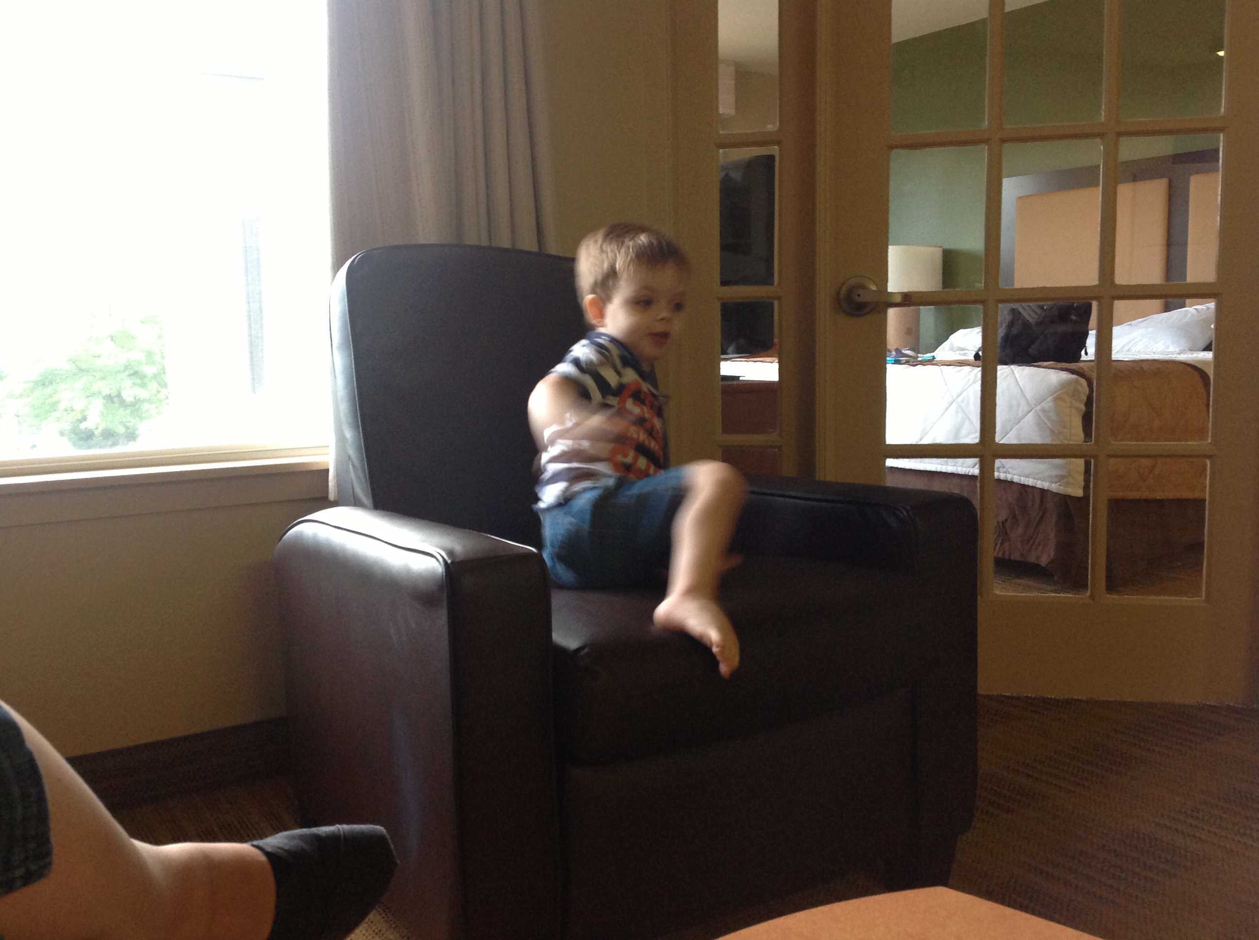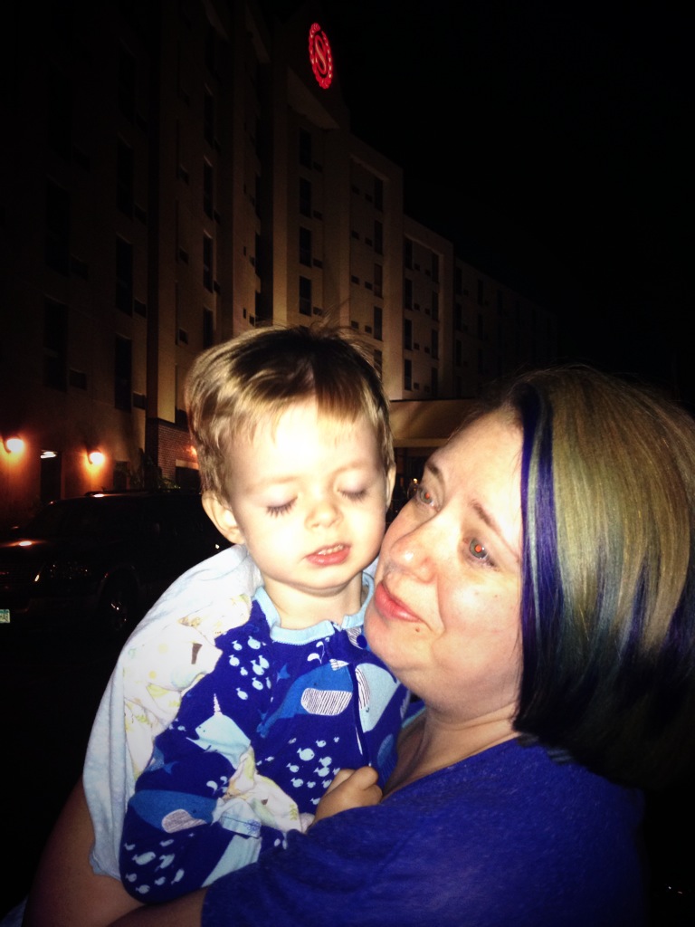 We drove to Wisconsin which took a lot longer than four hours, since you wanted to used the bathroom, eat and at one point, pull over to see the moon. Though it was rough on you, it was rewarding because at the end you saw Mimi and Doc. We all turned in for what we thought would be a nice night of sleep, but at 2 am the hotel fire alarm went off and you were carried down seven flights of stairs in your jammies. Mimi had her jammies on too, so you weren’t out of place.